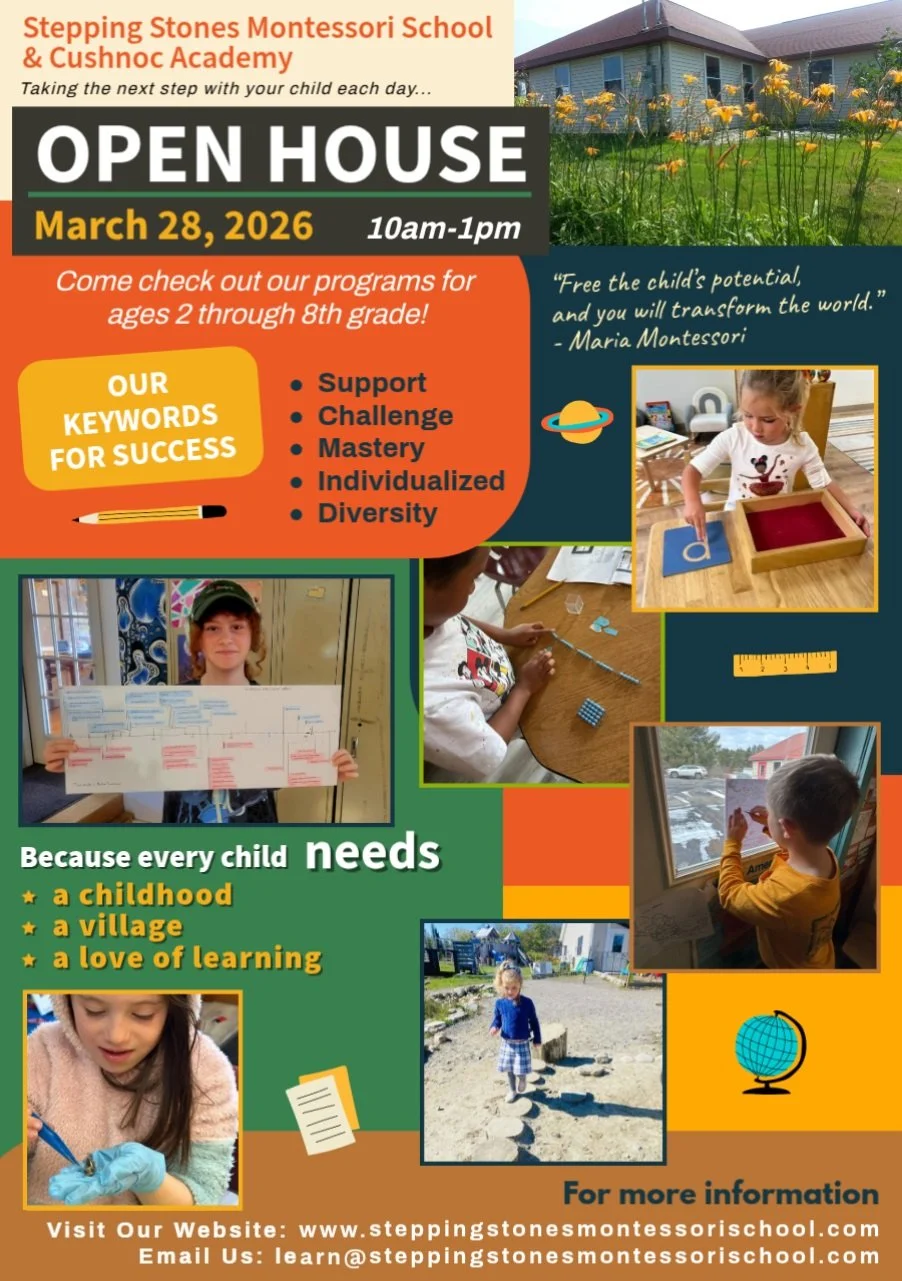 Welcome to the community of Stepping Stones Montessori School--an Augusta, Maine private school with Montessori programs for Pre K to Grade 3, as well as home of Cushnoc Academy at Stepping Stones, a mastery-based education for Upper Elementary (Gr 4-6) and Middle School (Gr 7/8). We support and challenge students in their steps toward mastery.